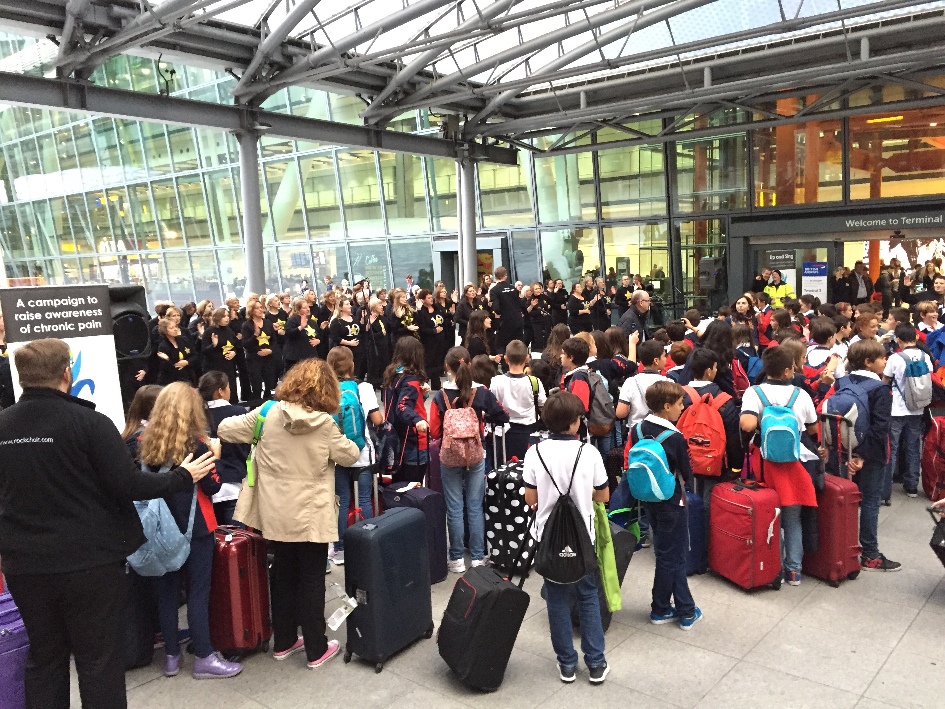 We had a fantastic day at T5 London Heathrow today with around 800 Rock Choir members singing out for UP. There were some memorable moments as favourite songs were performed to passengers and staff as they walked through the corridor of melody between the opposing choirs, including a rugby team and a school tour, both of whom joined the spirit of the occasion. Here are some clips from the today: